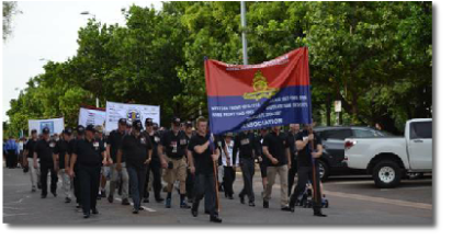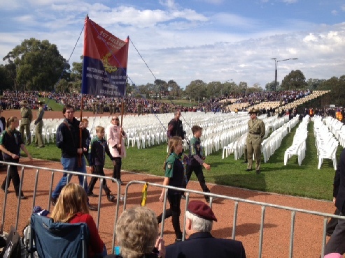 The banner party leading the Black Sheep off the AWM Parade Ground following the taking of the salute by His Excellency Sir Peter Cosgrove.